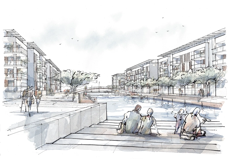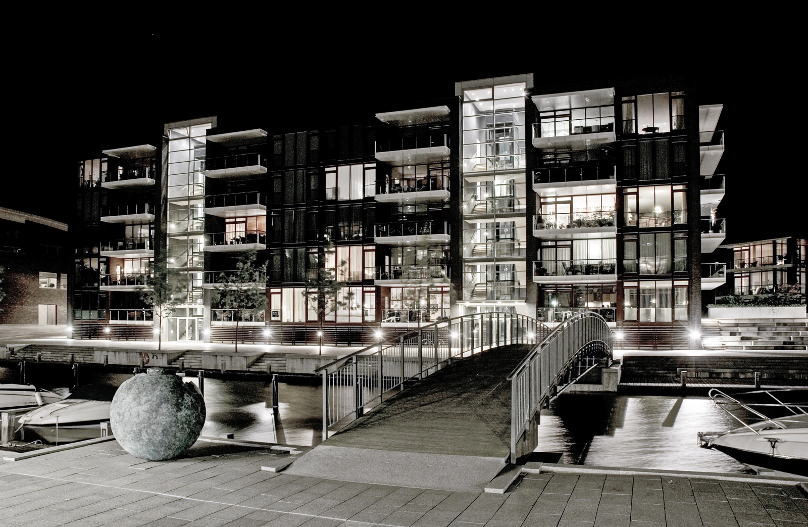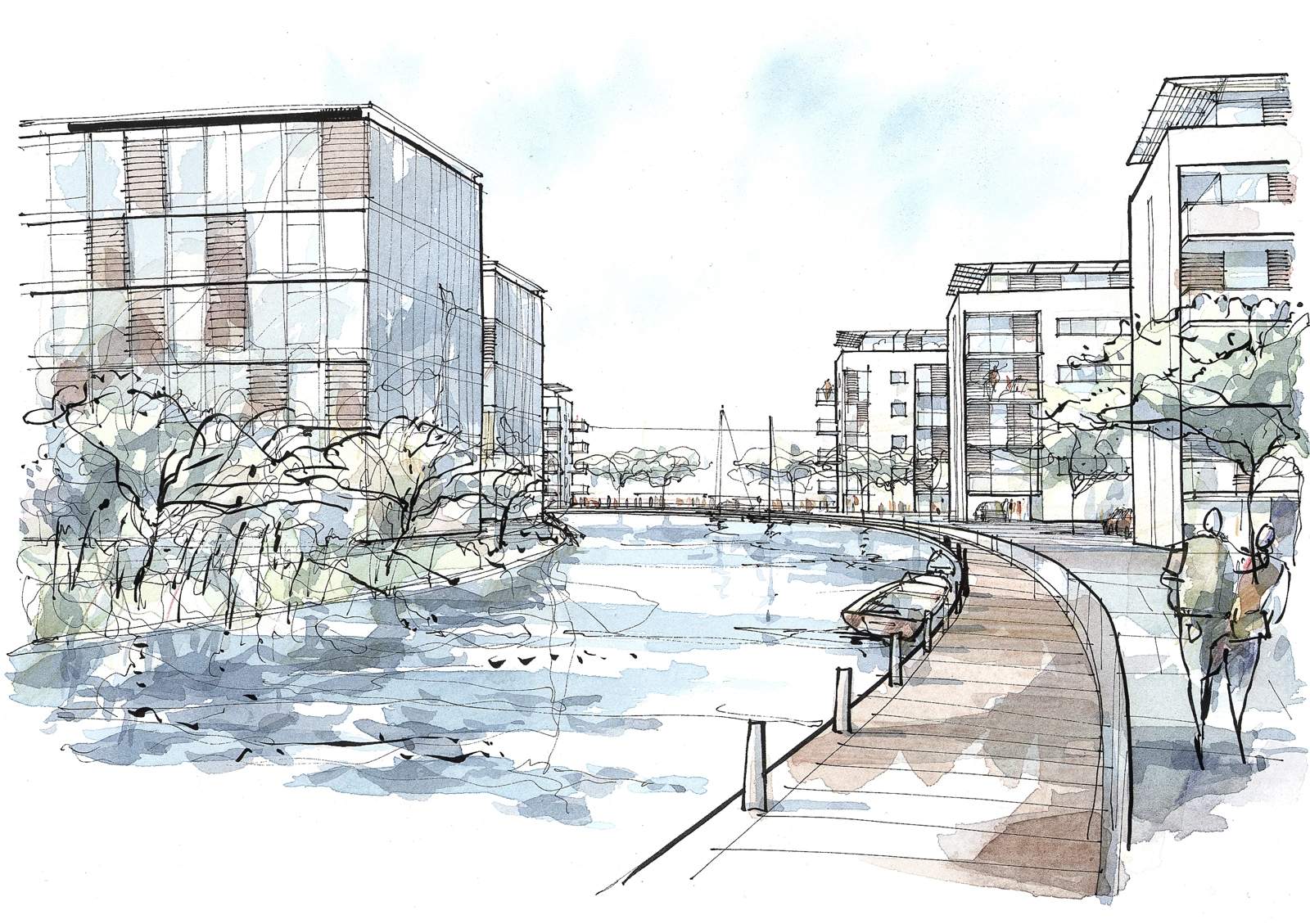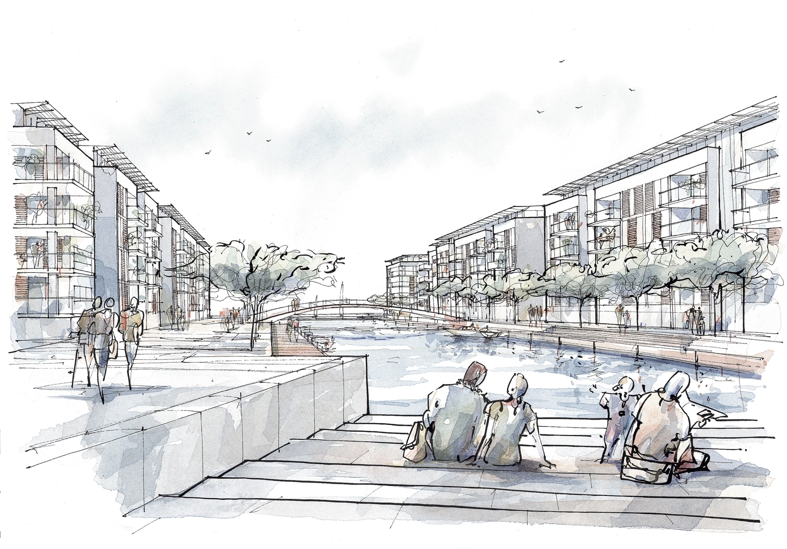 Området ligger smukt ud til Øresund med en kanal som det samlende element, der spejler de i alt fire længebygninger, som bebyggelsen består af.