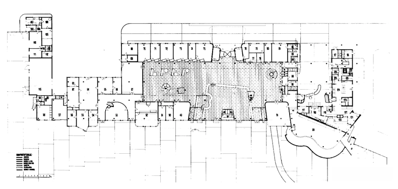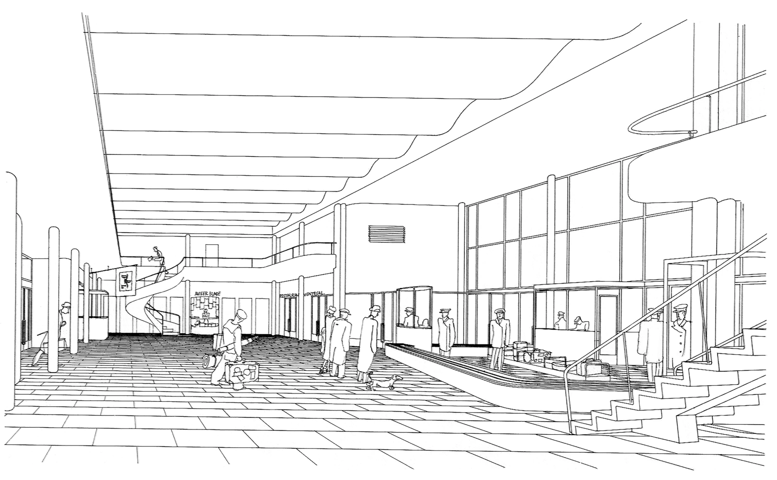Bygningen guidede den rejsende logisk og hurtigt gennem hallen og terminalens funktioner – fra udhænget over indgangen til gaten. Det lange, lyse rum gav et godt overblik over lufthavnens tilbud som restauranten, kiosken og banken. Gennem hallen passerede de rejsende en service-ø, som delte flowet af ankommende og afrejsende passagerer. Vindeltrappen og one-flight stairs gav adgang til første sal, hvor flyselskaber og offentlige luftfartsmyndigheder holdt til.