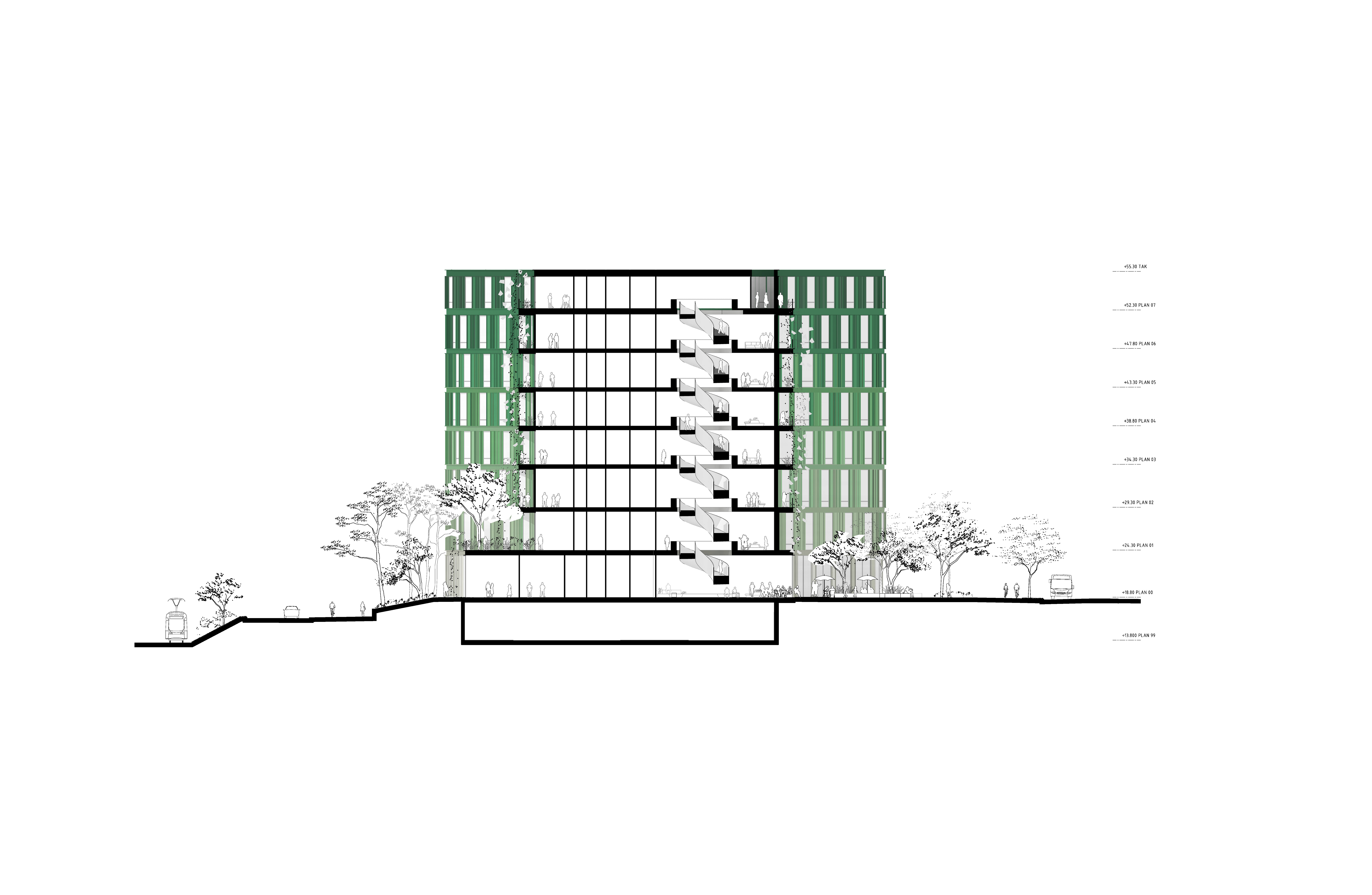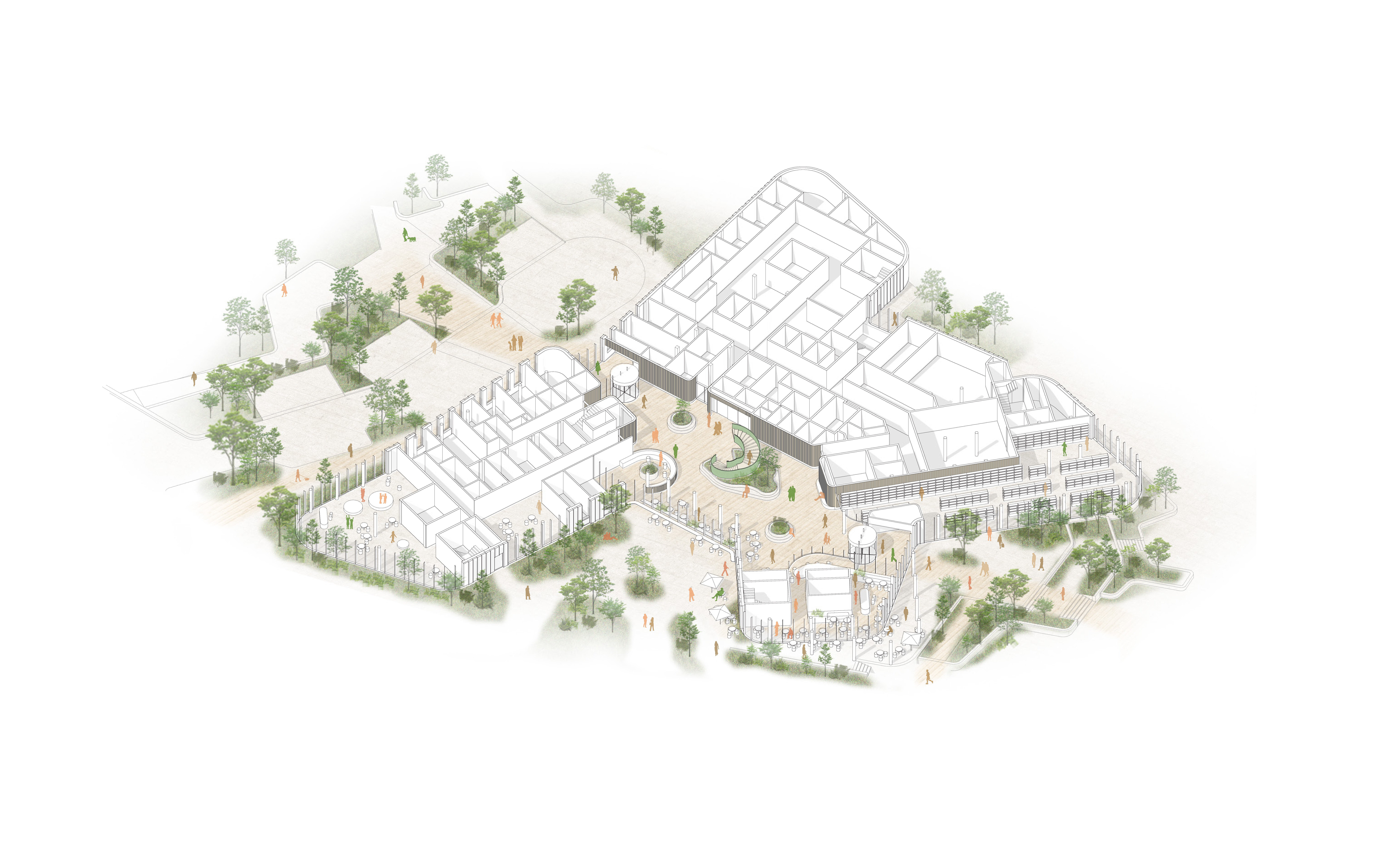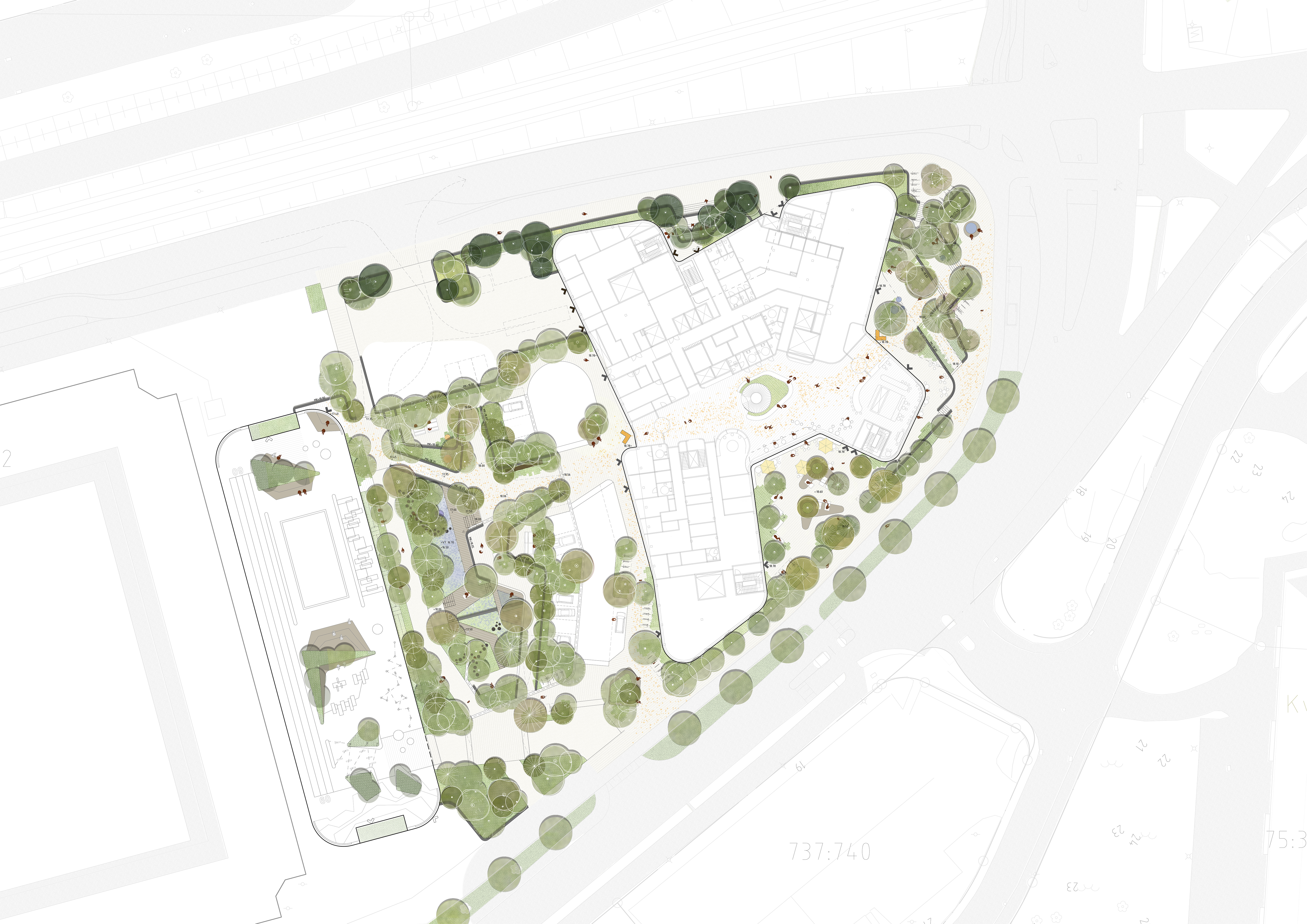 På et sted, hvor der i dag er en tankstation og McDonalds, vil det nye nærsygehus blive omgivet af en frodig park, der bliver et naturligt samlingspunkt for det omkringliggende område. Grønne forbindelser kommer til at dække i alt 26.000 kvadratmeter og indeholde lokaler til både primær- og specialpleje, herunder funktioner som obstetrik, psykiatri, sundhedspleje og tandpleje.