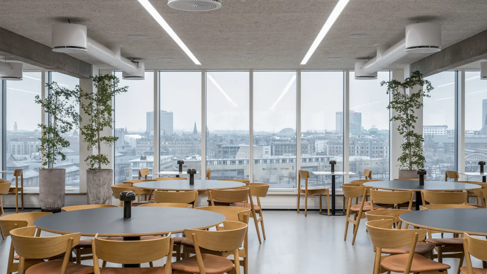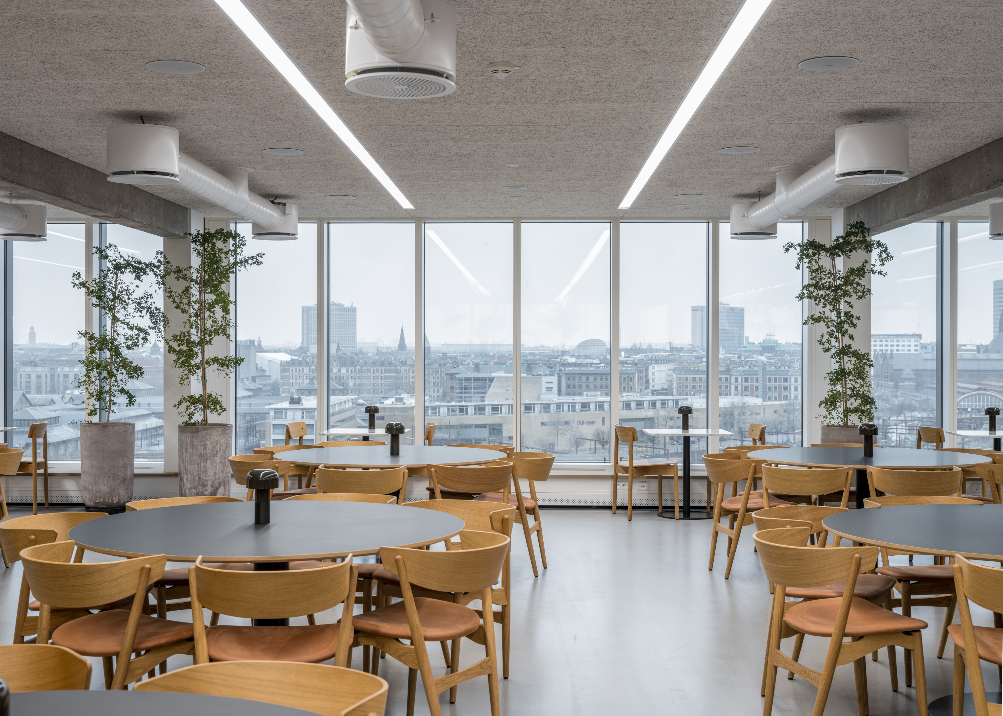 In the project, there has been a special focus on acoustics, where large parts of the building's surfaces are acoustically damped with handmade, micro-perforated hot-rolled steel panels with sound-absorbing material behind. They inscribe themselves in the character of the building and together with the raw concrete elements and solid oak, they create a warm, honest and Nordic atmosphere and experience.