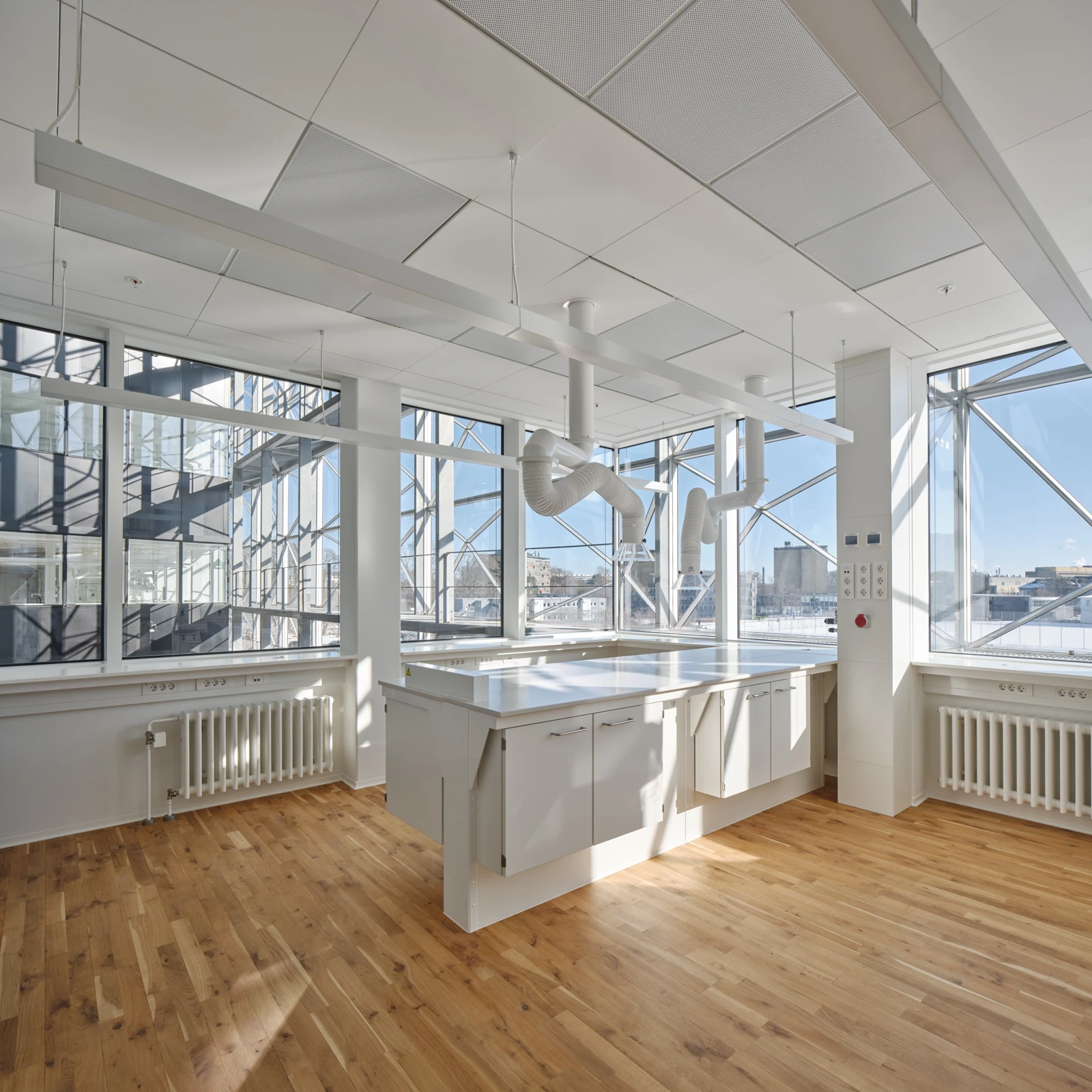 The building is part of the Government’s investment plan for the modernisation of university laboratories and is being constructed in two phases on either side of Jagtvej. Phase 1 is located on the eastern side of Jagtvej with approximately 36,500m2 in the University Park, while Phase 2 will be established on the western side of Jagtvej with approximately 15,500m2 in a business area. The two buildings will be connected by a ‘skywalk’ over Jagtvej, decorated on the underside by the artist, Malene Bach.