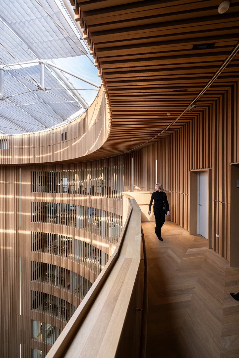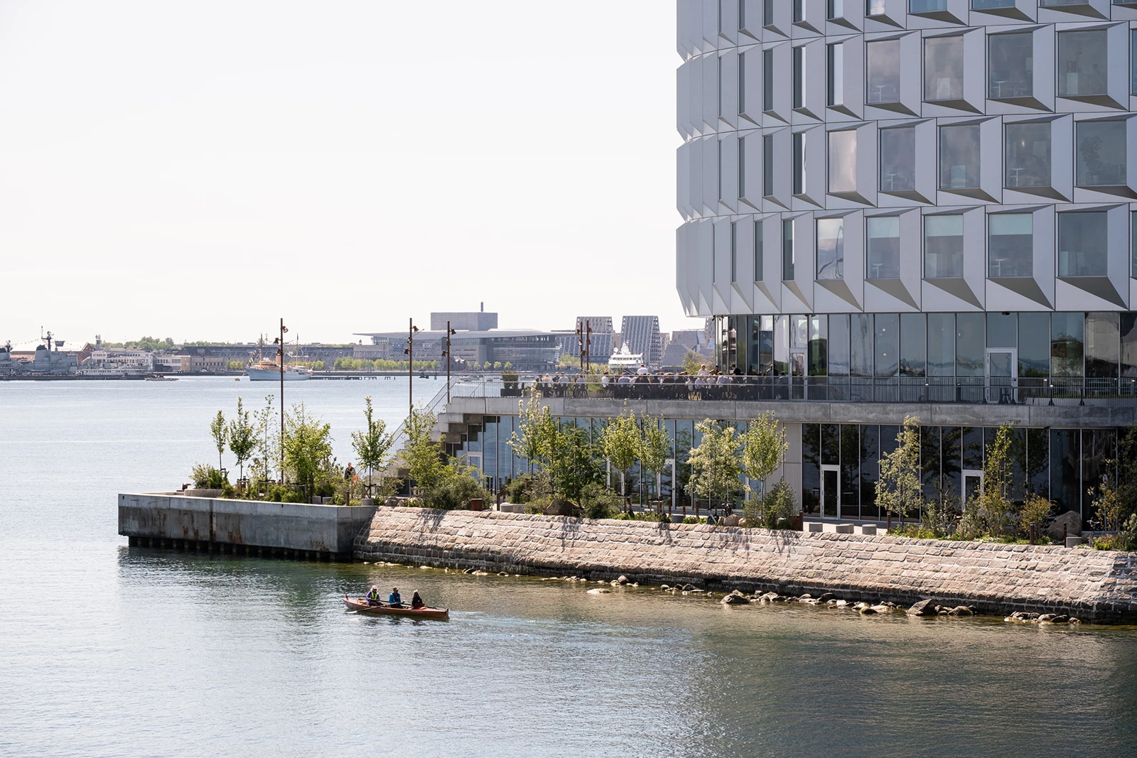 The distinct facade is simple and well proportioned, with textural and tactile surfaces that have a warm and welcoming expression. Its large scale is set to match the scale of the harbour space. It is clad in glass that reflects the water, which contributes to excellent daylight conditions, great views, and lowers the level of energy consumption needed for cooling. Diffuse skylight has low energy levels and offers optimal natural light conditions, whereas direct sunlight comes with a risk of glare and overheating.