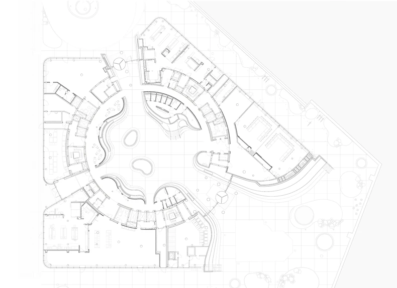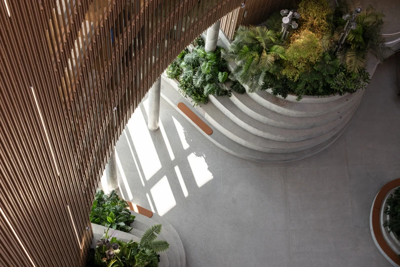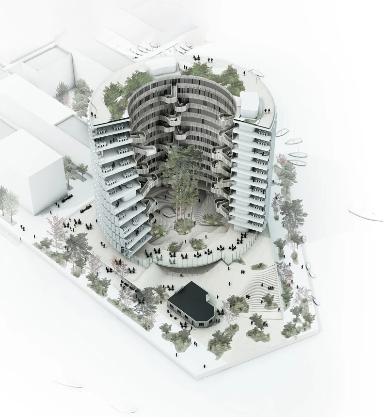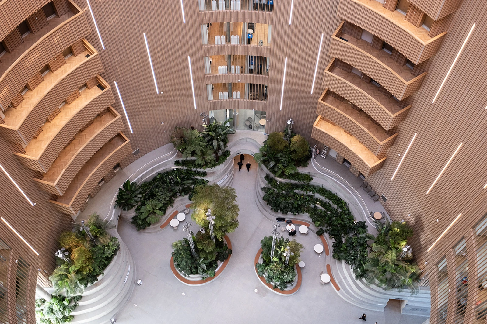 Inside, is a circular verdant public garden with tall trees – an interior green space where a generous diameter ensures plenty of natural daylight.