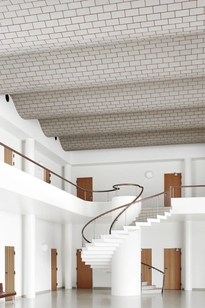The airport terminal has tactile, visual, and aural qualities, but was not an expensive building like the Radio House. It was made from cheaper, more industrial materials. The striking brass banister on the staircase and the Greenland marble cladding at the entrances are exceptions. Several of the walls are clad with Junker’s beech parquet.